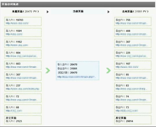 訪客經(jīng)常在網(wǎng)站中的各個(gè)頁面之間跳轉(zhuǎn),訪問的路徑不勝枚舉,但可以通過觀察焦點(diǎn)頁面及其上下游頁面,掌握訪客的來路和去向,發(fā)現(xiàn)較普遍的訪客訪問習(xí)慣。頁面訪問軌跡即用來完成該功能,用戶可自由指定觀察焦點(diǎn)頁面,系統(tǒng)會列出該頁面的前十位來路頁面和去向頁面。對觀察焦點(diǎn)頁面而言,其自身的導(dǎo)入、導(dǎo)出PV的多少能夠反映出該頁面在網(wǎng)站的權(quán)重地位,而通過觀察來源和去向頁面又能最大限度的了解到訪客的行為習(xí)慣及興趣點(diǎn)。