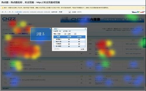 CNZZ統(tǒng)計(jì)工具在設(shè)計(jì)及研發(fā)上更加注重用戶體驗(yàn)與實(shí)用性,用戶只需將關(guān)注的受訪頁面鏈接添加到“熱點(diǎn)圖”功能中,并保證該頁面已成功放置CNZZ“站長統(tǒng)計(jì)”代碼,第二天即可查看“熱點(diǎn)圖”相關(guān)數(shù)據(jù)情況。在申請開通“熱點(diǎn)圖”功能后,用戶可同時(shí)關(guān)注十個(gè)熱點(diǎn)頁面。打開某一頁面熱點(diǎn)圖,興趣點(diǎn)展現(xiàn)一目了然,圖中紅色區(qū)域表示點(diǎn)擊熱度最高,橙色、黃色、綠色次之,而藍(lán)色區(qū)域則表示點(diǎn)擊熱度最低。