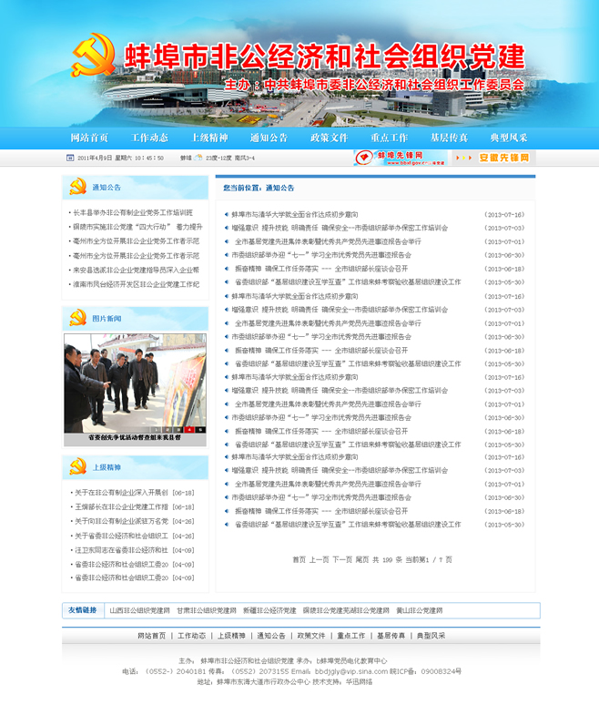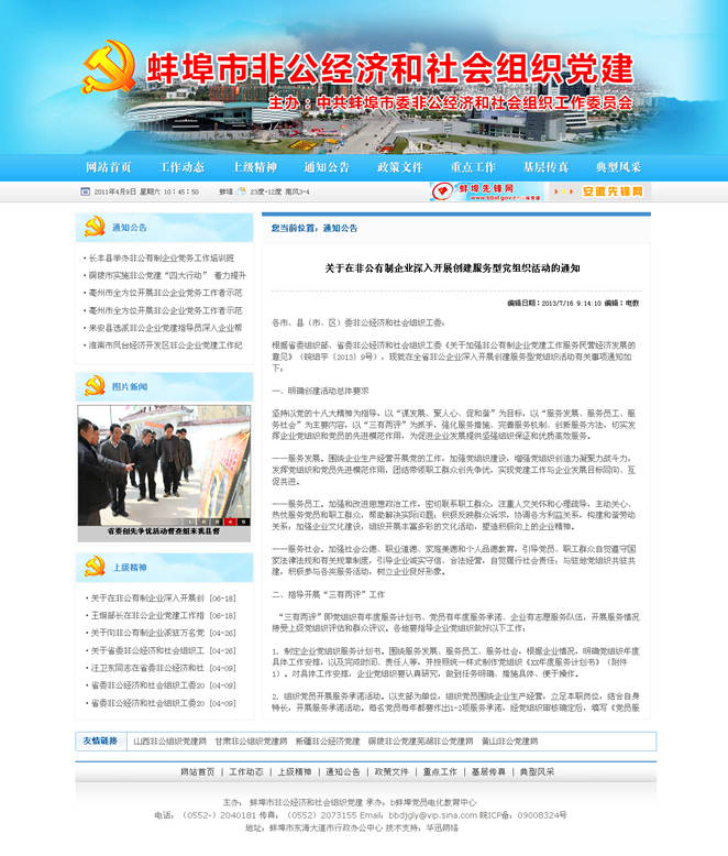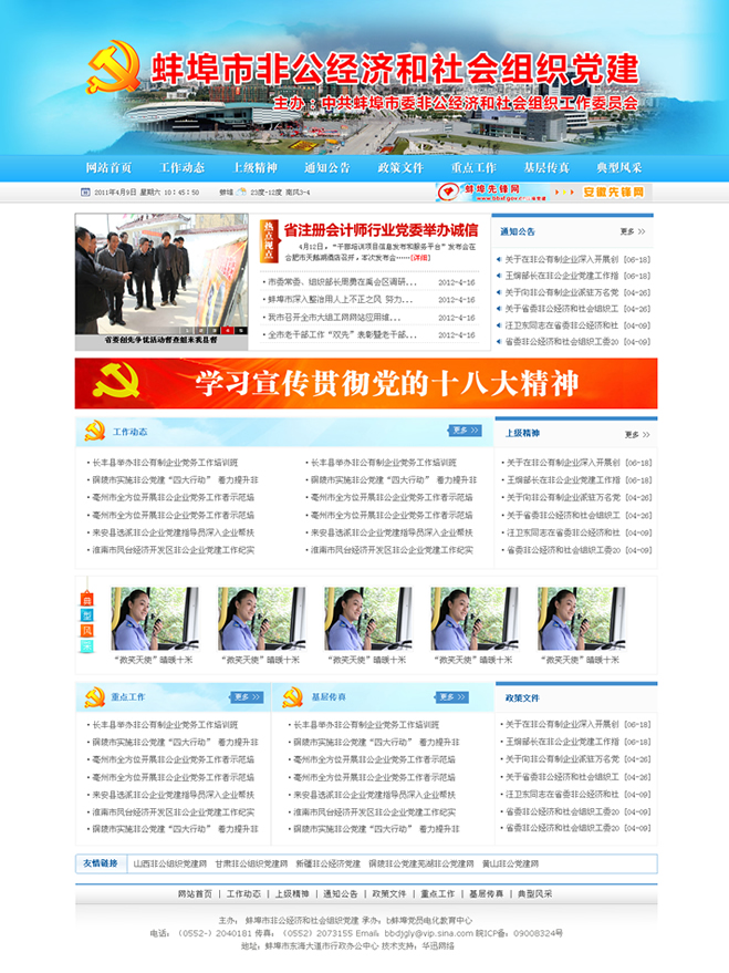 網(wǎng)頁由中共蚌埠市委非公經(jīng)濟(jì)和社會組織工作委員會,蚌埠先鋒網(wǎng)電教中心承辦,作為蚌埠先鋒網(wǎng)子欄目,主要用于蚌埠非公經(jīng)濟(jì)和社會組織黨建工作有關(guān)信息發(fā)布和經(jīng)驗交流。